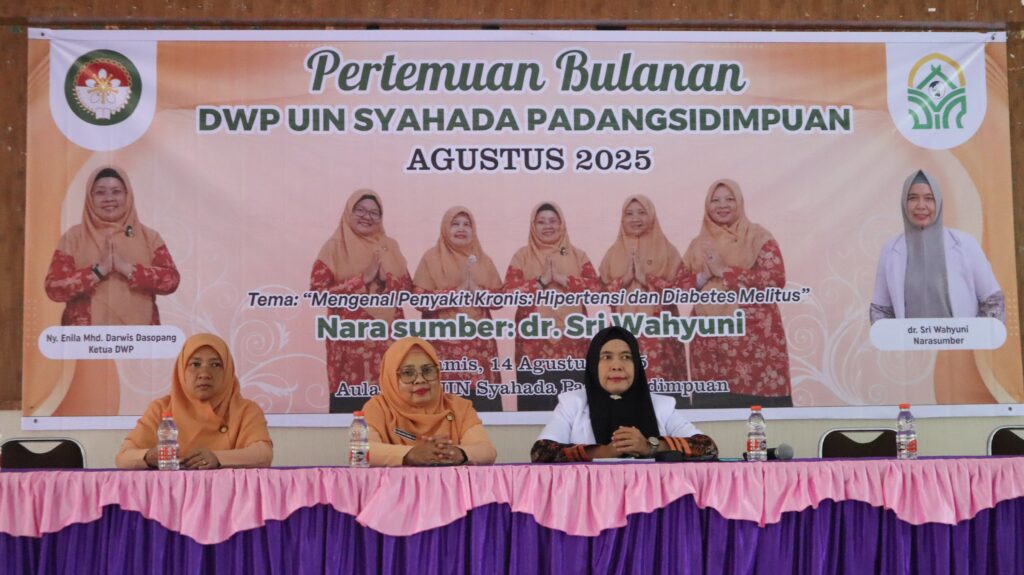 Padangsidimpuan – Dharma Wanita Persatuan (DWP) UIN Syekh Ali Hasan Ahmad Addary Padangsidimpuan mengadakan pertemuan bulanan di Aula Biro UIN Syahada, Kamis (14/8/2025). Kegiatan kali ini mengusung tema “Mengenal Penyakit Kronis: Hipertensi dan Diabetes Melitus” dengan menghadirkan narasumber dr. Sri Wahyuni.