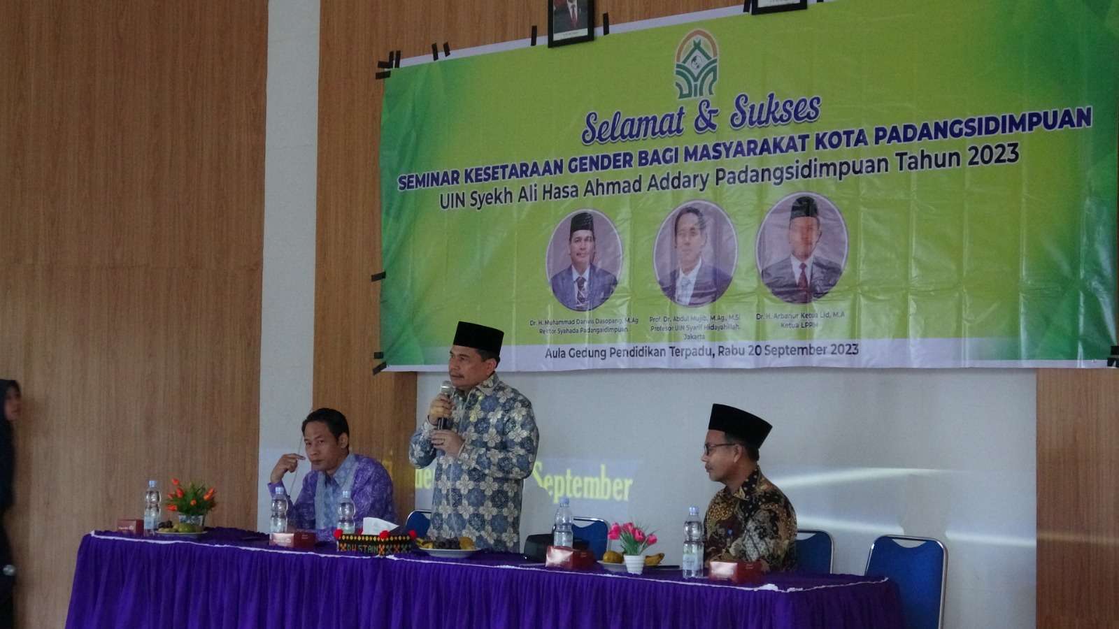 Selanjutnya terima kasih kepada Bapak Prof. Dr. Abdul Mujib, M. Ag selaku Guru Besar Psikologi UIN Syarif Hidayatullah Jakarta yang menjadi narasumber pada hari ini. Pencerahannya sangat diharapkan demi tercapainya pemahaman yang kokoh tentang eksistensi gender ditengah-tengah kehidupan sosial masyarakat kita terutama Kota Padangsidimpuan yang dikenal sebagai wilayah penganut patrialis”, ucap Rektor.