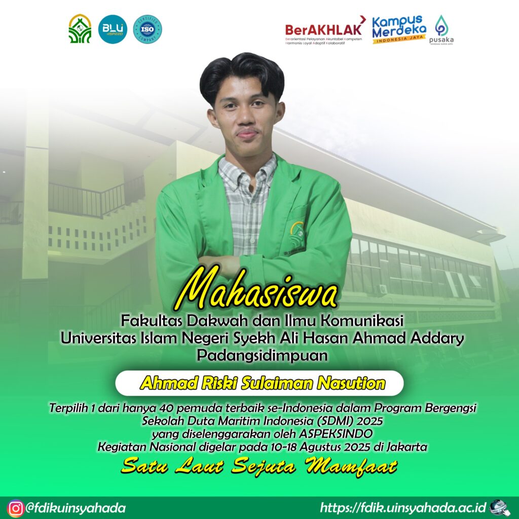Padangsidimpuan – UIN Syekh Ali Hasan Ahmad Addary Padangsidimpuan kembali menorehkan kebanggaan melalui kiprah mahasiswanya. Pada Rabu (14/8), Ahmad Riski Sulaiman Nasution, mahasiswa UIN Syahada yang terpilih sebagai peserta Sekolah Duta Maritim Indonesia (SDMI), tampil menyuarakan aspirasi masyarakat pesisir Mandailing Natal di hadapan anggota DPR dan MPR RI.