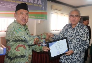 Dok.Humas: Prof.Dr.H.Ibrahim Siregar,MCL (Rektor IAIN Padangsidimpuan) memberikan piagam penghargaan kepada Dr. H. Imam Safe’i, M.Pd (Sekretaris Direktorat Jenderal Pendidikan Islam Kementerian Agama RI; keterangan : peci hitam) di Rapat Kerja IAIN Padangsidimpuan