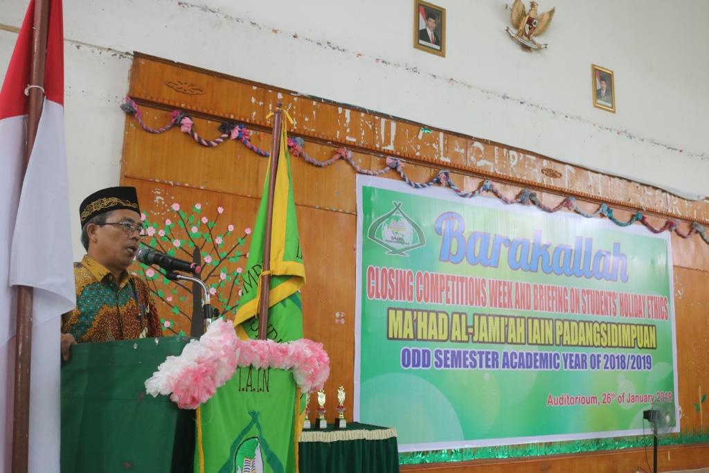 Kegiatan Penutupan Competisi Week & Briefing Holiday Ethics dilaksanakan oleh Mahad Jamiah IAIN Padangsidimpuan dengan menampilkan berbagai hasil karya dari seluruh mahasantri yang diperlombakan pada akhir penutupan perkuliahan. Penampilan mahasantri dengan kreasi alat-alat musik sederhana tampil memukau dengan lagu-lagu yang dibawakan dari Asrama Kampus II Baharuddin. Ada juga grup nasyid dari asrama putra dengan lantunan lagu islami ikut serta menyemarakkan kegiatan. Puncak acara tersebut adalah pemberian hadiah penghargan bagi para pemenang kompetisi dari seluruh asrama. Hadiah diberikan langsung oleh para pimpinan kepada perwakilan asrama pemenang dan diakhiri dengan foto bersama di atas podium Auditorium IAIN Padangsidimpuan.