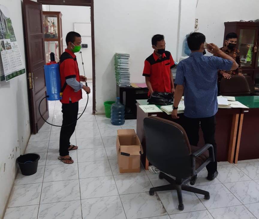 Dok. Humas (05/06/2020) Para Petugas Melaksanakan penyemprotan disikfektan di ruangan pada hari pertama kerja New Normal di IAIN Padangsidimpuan