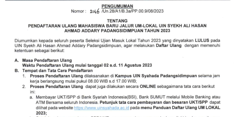 Untuk tata cara daftar ulang pada UM-Lokal di UIN Syahada Padangsidimpuan dapat dilihat pada pengumuman di bawah ini