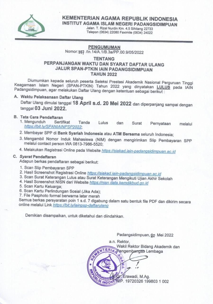 PENGUMUMAN PERPANJANGAN DAFTAR ULANG SPAN-PTKIN 20 May 2022 Pengumuman Diumumkan kepada yang dinyatakan lulus SPAN-PTKIN Tahun 2022 bahwa pendaftaran ulang untuk IAIN Padangsidimpuan di Perpanjang sampai dengan Tanggal 3 Juni 2022 Kontributor : Humas UIN Syahada Padangsidimpuan Share: Sebelumnya Upgrading FORMAKIP untuk Regenerasi Kepemimpinan dan Pengurus tahun 2022 Selanjutnya IAIN Padangsidimpuan Mewisuda 544 Lulusan pada Wisuda Sarjana dan Pascasarjana… Related Posts UIN Syahada Padangsidimpuan Peroleh Beasiswa Bank Indonesia, Perkuat Kapasitas Akademisi dan Mahasiswa… Muhammad Nanda Purba • 14 Apr 2026 Besaran Uang Kuliah Tunggal (UKT) Tahun Akademik 2026/2027 Alexandra Pane • 9 Apr 2026 Pedoman Berasrama Program Ma’had Al-Jamiah Alexandra Pane • 9 Apr 2026