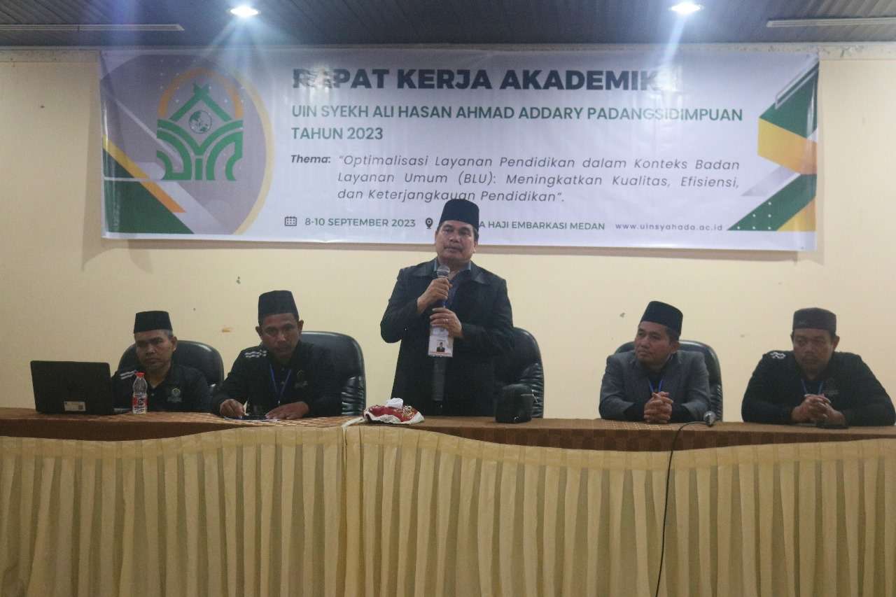 Medan, 10/09/2023 – UIN Syekh Ali Hasan Ahmad Addary Padangsidimpuan menggelar Rapat Kerja Akademik yang berlangsung dari 8 hingga 10 September 2023 di UPT Asrama Haji Emberkasi Medan. Rapat ini dihadiri oleh 50 peserta yang terdiri dari Ketua Program Studi, Dekan-Dekan Fakultas, Kepala UPT, dan Ketua Lembaga di UIN Syahada Padangsidimpuan. Tujuan utama kegiatan ini adalah untuk mempercepat dan mengoptimalisasi pelayanan akademik dalam konteks Badan Layanan Umum (BLU). Peningkatan sistem dan perbaikan pelayanan administrasi dan akademik kemahasiswaan menjadi fokus utama dalam rapat kerja ini. Kegiatan ini juga bertujuan sebagai evaluasi berbagai bentuk pelayanan akademik kemahasiswaan yang ada di UIN Syekh Ali Hasan Ahmad Addary Padangsidimpuan.