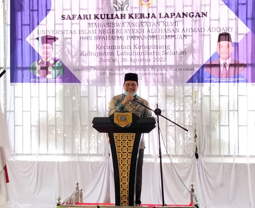 Jum’at (26/08/2022) Labuhan Batu Selatan – Keberadaan Universitas Islam Negeri Syekh Ali Hasan Ahmad Addary Padangsidimpuan yang berubah bentuk dari IAIN padangsidimpuan merupakan milik semua ummat, hal ini ditegaskan Rektor dalam sambutannya dalam safari KKL angkatan XLVII tahun 2022 di Kota Pinang Kabupaten Labuhan Batu Selatan.