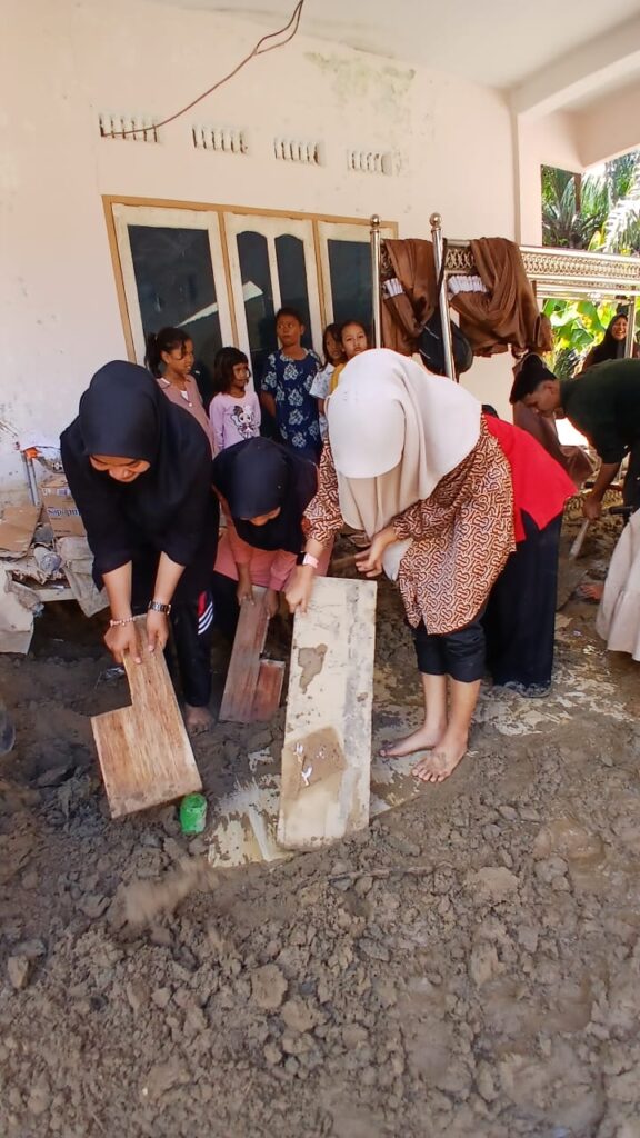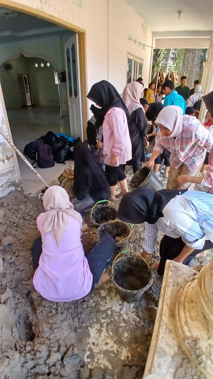 Tim FDIK membersihkan bagian dalam dan luar masjid, termasuk lantai, karpet, dinding, tempat wudu, dan area halaman yang tertimbun lumpur akibat banjir. Aktivitas ini dilakukan secara gotong royong bersama warga setempat.