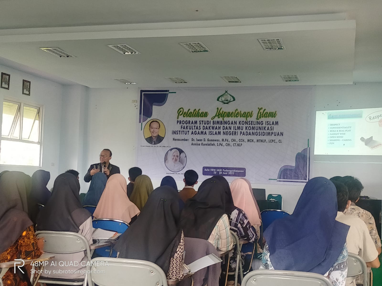 Selasa (28/06/2022); Terhitung selama 3 hari sejak Selasa sampai dengan Kamis (28-30 Juni 2022), Program Studi Bimbingan Konseling Islam, Fakultas Dakwah dan Ilmu Komunikasi IAIN Padangsidimpuan menggelar pelatihan Hypnotherapi Islami kepada mahasiswa/mahasiswi semester empat. Kegiatan yang menghadiri Trainer Internasional, seorang Profesional Hypnotherapist, coach, lecture dan trainer juga CEO dari Transformasi Indonesia, yaitu Dr. Iwan Dudy Gunawan, S.S., M.Pd., CH., CCH., MCH., CMT., NNLP., CI serta Annisa Kurniallah, S.Pd., C.Ht., CT.NLP dibuka secara resmi oleh Plh. Dekan Fakultas Dakwah dan Ilmu Komunikasi, Dr. Anas Habibi Ritonga, MA.