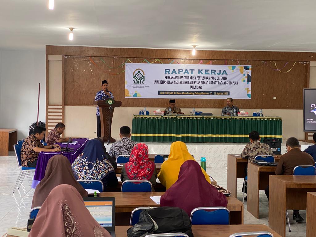 “Bapak/Ibu pimpinan, kami laporkan bahwa Rapat Kerja Pembahasan Pagu Deenitif ini dilandasi hukum dengan keluarnya Surat Keputusan Rektor UIN Syekh Ali Hasan Ahmad Addary Padangsidimpuan, nomor 699 Tahun 2022, tentang penetapan panitia, peserta, narasumber dan pembahas di acara tersebut. Kegiatan ini akan berlangsung selama 3 hari, yaitu Rabu sampai dengan Jum’at (10 – 12 Agustus 2022) ini, dengan jumlah peserta sebanyak 58 orang peserta terdiri dari unsur pimpinan dan pengelola anggaran keuangan di lingkungan Universitas Islam Negeri Syekh Ali Hasan Ahmad Addary Padangsidimpuan,” ungkap Buyung Saroha Nasution, M.Pd