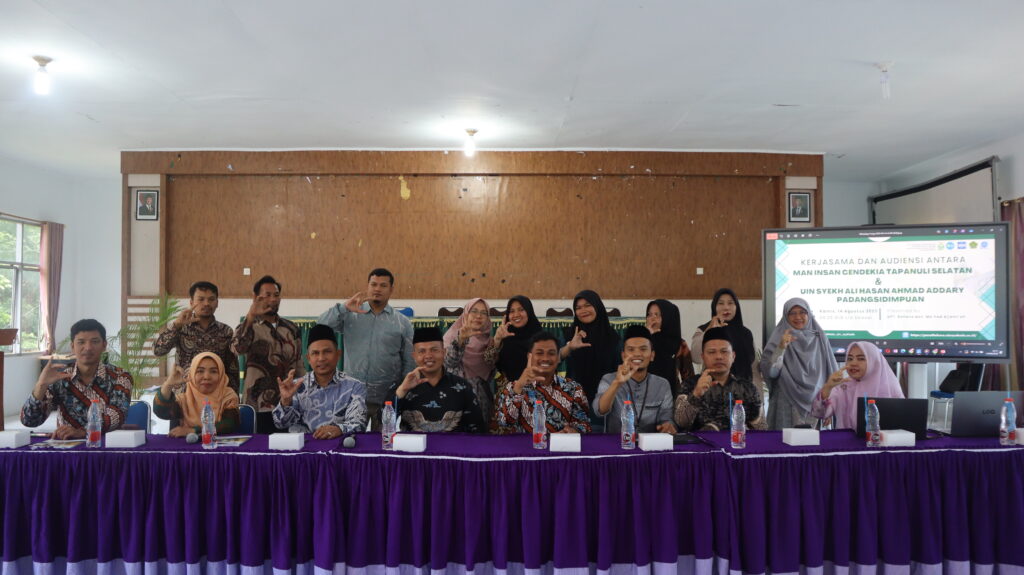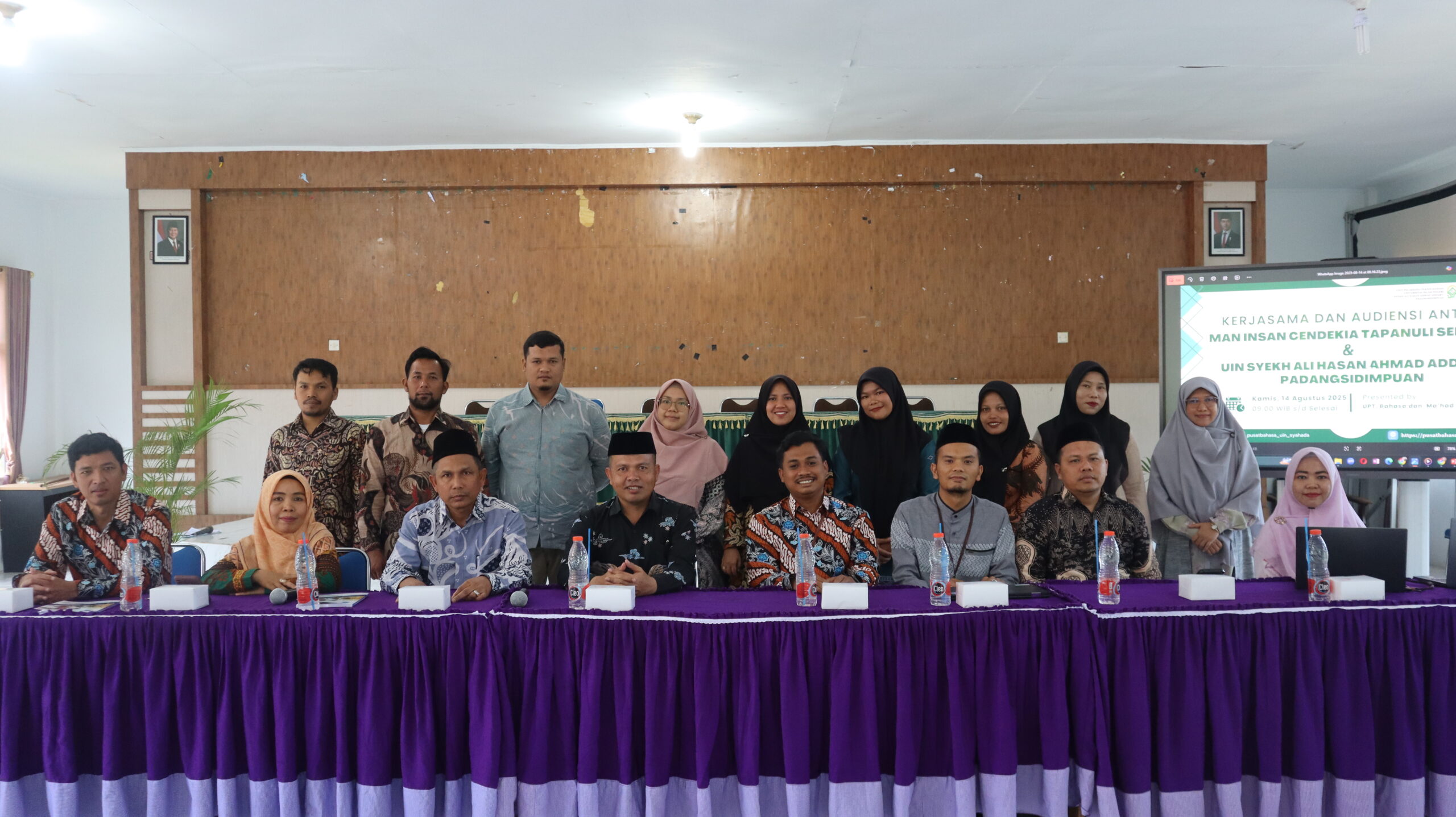 Padangsidimpuan — Universitas Islam Negeri (UIN) Syekh Ali Hasan Ahmad Addary Padangsidimpuan dan Madrasah Aliyah Negeri (MAN) Insan Cendekia Tapanuli Selatan resmi menjalin kerja sama dan menggelar audiensi pada Kamis, 14 Agustus 2025, di Aula Biro UIN Syahada Padangsidimpuan. Kegiatan ini menjadi langkah strategis untuk memperkuat sinergi dalam bidang pendidikan, bahasa, dan pengembangan karakter siswa.